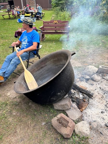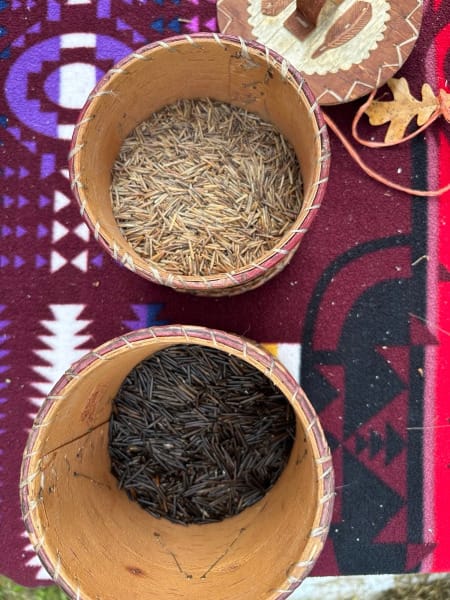 The ricer is sitting next to a fire made of split pine balancing a cast iron cauldron right out of a medieval scene—it must weigh close to two hundred pounds. He is holding a canoe paddle which they use to periodically scrape and scoop the rice and to toss it onto the hot sided kettle where it cures and parches and falls back down where it is kept warm. He is able to parch three to five gallons at a time. Parching seals the berry and allows it to be stored until needed. A gallon of rice weighs seven pounds. A pound sells for $28. This is a sustainable economy.