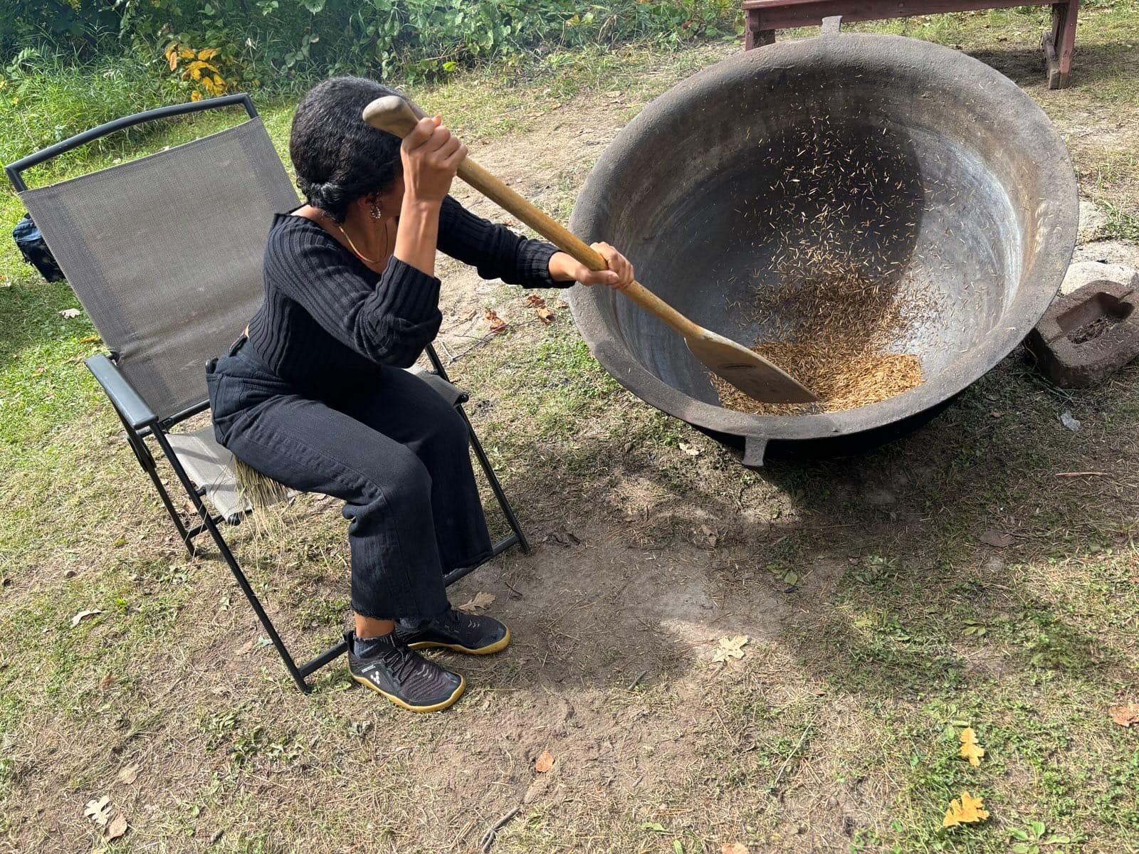 Before parching the hulled rice is lightly ground so it can be separated from the hull. Traditionally this was done with the balls of ones moccassined feet, stepping and twisting. Instead, he has rigged up a stand threaded with two seven and a half pound barbells on a blanket, to save labor. To be able to parch on his own. The rice is considered done when it smells toasted, when the hulls are so dry and fine that they fly through the air with each oar scrape. It is then put into low woven trays (birch) to cool and then bounced to lose hulls to the breeze, and the rice is cleaned and ready for storage.