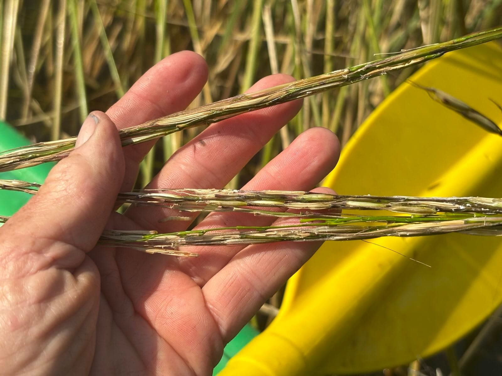 The awns are longer than the berry itself. I wade the shoreline and pick a few grains still stuck on my shorts and drop them one by one into the water. Heavy, the rice rockets down and drills into the silt. The awl acts as an aid to spin and drive to the depth the seed plants itself. I drop grains as I walk the waters edge, my feet feel the fine sand, silt, dense mattings of roots go—planting rice.